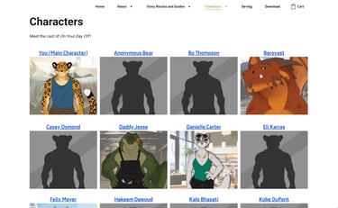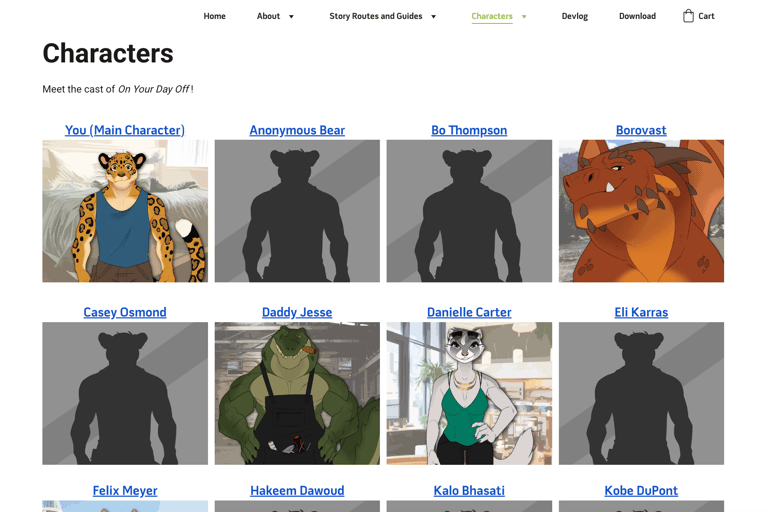 This page contains a comprehensive listing of the characters you'll encounter in On Your Day Off. Each individual character page includes the following:
