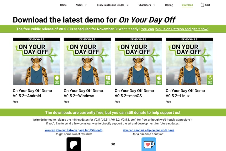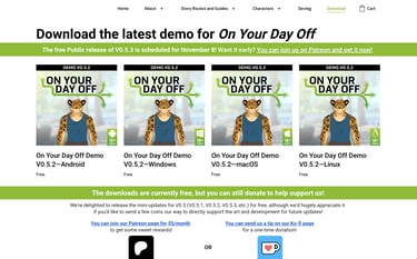 Our Patreon and Ko-Fi sites are still available, as are our Discord server and our page on itch.io, although onyourdayoff.com is meant to be the central hub for information/game files for this project.