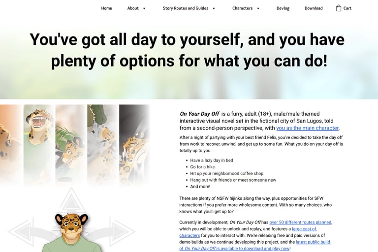 This is our development log, where we'll post announcements, important updates, and release notes for each demo of On Your Day Off. We might also make posts that ask for your input, so be sure to keep an eye on this page just in case!